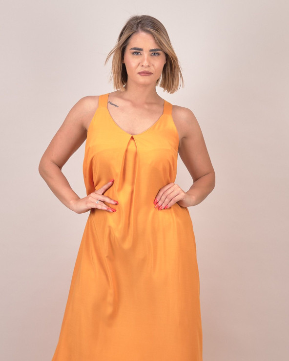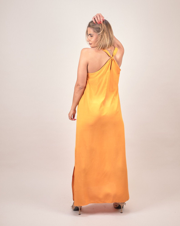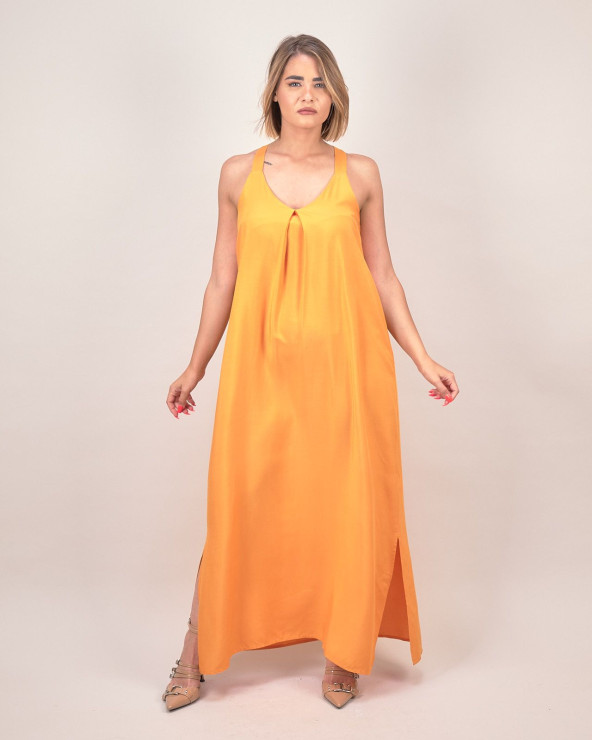 Realizzato in 100% viscosa, questo abito estivo garantisce freschezza, comfort e traspirabilità. Il taglio lungo con piccoli spacchi laterali offre un tocco moderno e pratico, perfetto da indossare con sandali flat di giorno o con zeppe e accessori colorati per un outfit da sera. L’abito è ideale per la moda donna estate 2025, grazie al suo colore caldo e vitaminico che esalta l’abbronzatura e dona energia a ogni look.