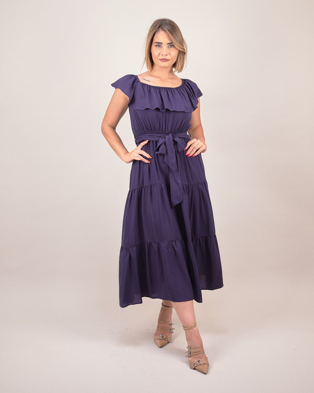 Dona un tocco di freschezza e femminilità al tuo guardaroba con questo abito lungo in viscosa, pensato per chi ama un look elegante ma confortevole. Il modello presenta uno scollo arricciato con delicata balza che valorizza il décolleté, mentre il taglio a balze ampie crea un movimento fluido e leggero. L’abito è completato da una cintura tono su tono da annodare in vita, perfetta per mettere in risalto la silhouette senza costrizioni.