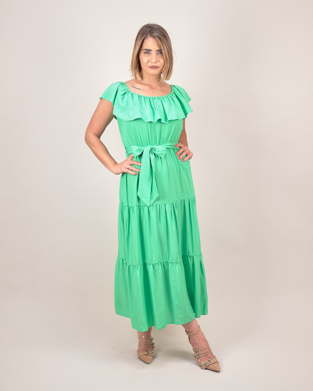 Dona un tocco di freschezza e femminilità al tuo guardaroba con questo abito lungo in viscosa, pensato per chi ama un look elegante ma confortevole. Il modello presenta uno scollo arricciato con delicata balza che valorizza il décolleté, mentre il taglio a balze ampie crea un movimento fluido e leggero. L’abito è completato da una cintura tono su tono da annodare in vita, perfetta per mettere in risalto la silhouette senza costrizioni.