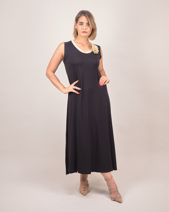 Elegante e versatile, questo abito lungo con fiore decorativo sullo scollo è pensato per chi desidera uno stile sofisticato senza rinunciare alla praticità. Il taglio scivolato e la linea pulita lo rendono perfetto per ogni occasione: dalle cerimonie estive agli eventi casual chic. Il fiore applicato sullo scollo aggiunge un tocco romantico e raffinato, ideale per valorizzare la zona del décolleté con delicatezza.