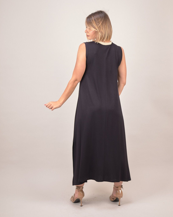 Realizzato in morbida viscosa con una leggera percentuale di elastan, questo vestito offre una vestibilità fluida, che accarezza le forme senza segnare. La lunghezza maxi slancia la figura, mentre il girocollo a contrasto crea un raffinato punto luce. Questo abito è un’ottima scelta per chi cerca abbigliamento donna elegante ma comodo, da indossare sia di giorno con sandali bassi, sia di sera con accessori preziosi.