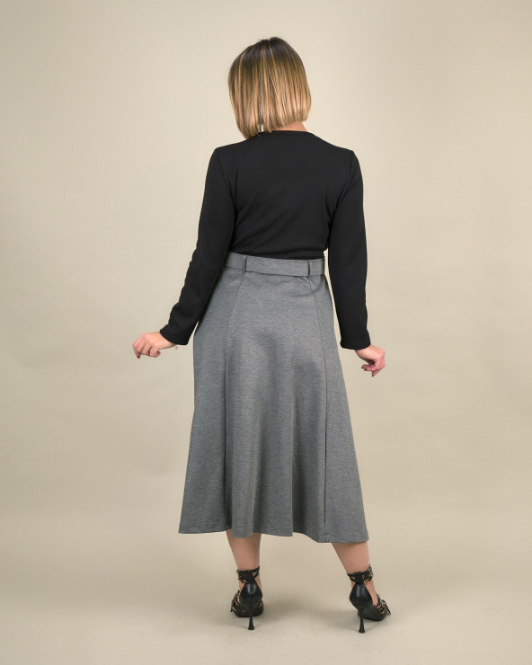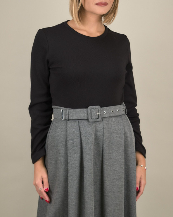 La parte superiore in tinta unita nera si abbina armoniosamente alla gonna grigia svasata, creando un contrasto sobrio e chic. La cintura tono su tono in vita sottolinea la silhouette e aggiunge un dettaglio sofisticato al design minimal.