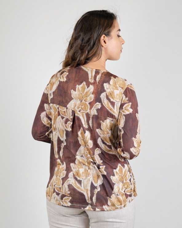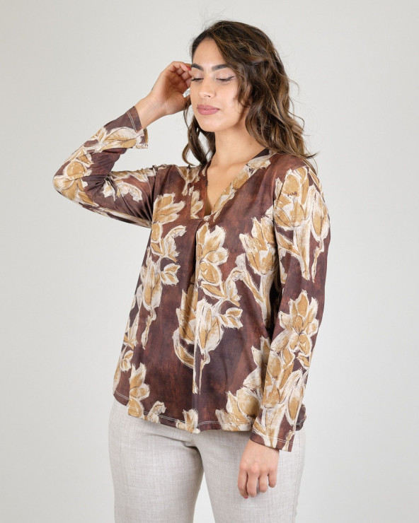 Blusa in tessuto di jersey in fantasia marrone, scollo a V, linea svasata.