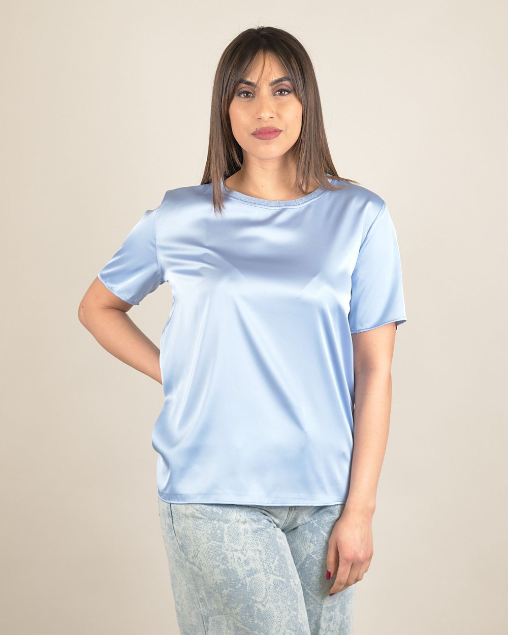 T-shirt polvere in raso con scollo in lurex