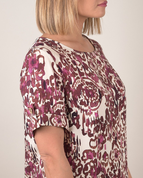 Aggiungi un tocco artistico e sofisticato al tuo guardaroba con questa casacca lunga in pura viscosa. Il design morbido e fluido scivola delicatamente sul corpo, offrendo una vestibilità comoda e adatta a ogni silhouette. La stampa astratta nei toni del borgogna e rosa su fondo chiaro regala un look moderno e dinamico, perfetto sia per il giorno che per la sera. Le maniche corte con risvolto e l’orlo asimmetrico aggiungono un tocco casual-chic, ideale da abbinare a pantaloni coordinati o jeans per uno stile effortless. Il tessuto leggero e traspirante la rende perfetta per la stagione calda, mantenendo sempre un’eleganza ricercata.