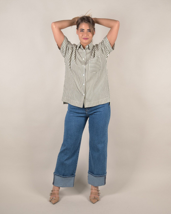 Camicia a manica corta dal taglio classico rivisitato in chiave contemporanea, perfetta per completare outfit casual o più curati. Realizzata in un morbido tessuto fluido di viscosa e poliammide, questa camicia si distingue per il motivo a righe verticali verde militare che slancia la figura.