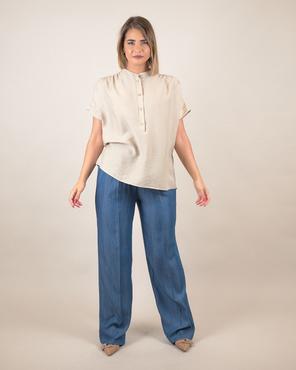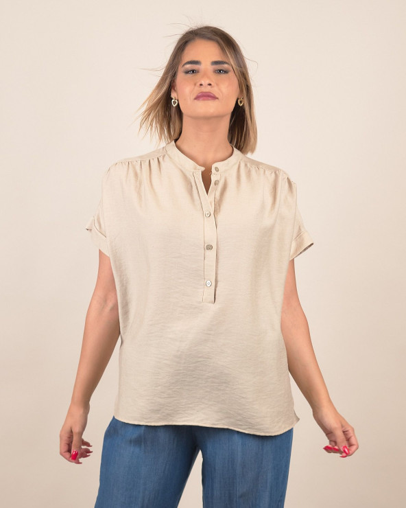 Camicia dallo stile semplice e raffinato, realizzata in un fresco misto lino, viscosa e nylon. Il modello presenta scollo serafino con mezza abbottonatura frontale e maniche corte con risvolto cucito, perfette per offrire comodità e libertà di movimento nelle giornate più calde.