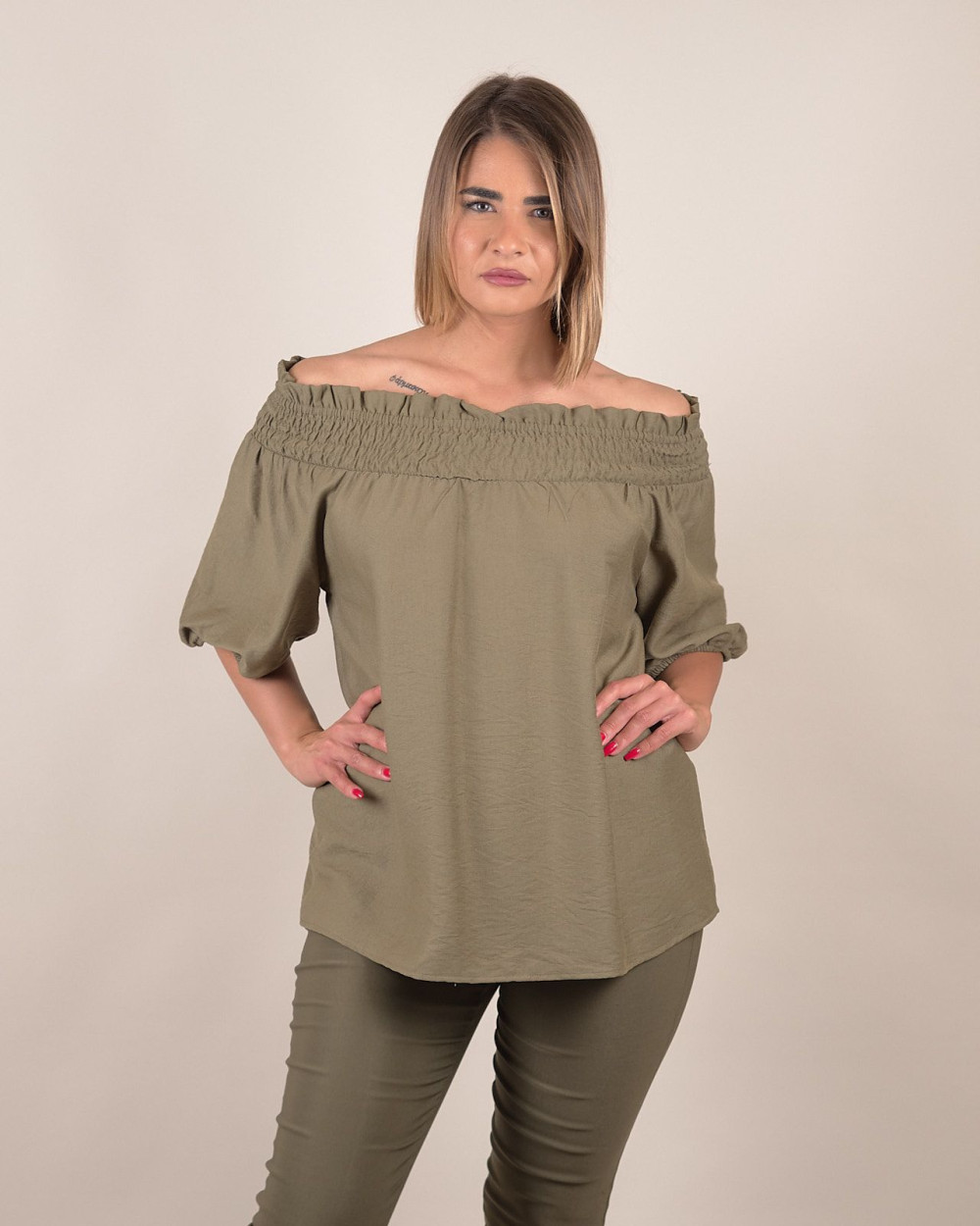 Seducente e leggera, questa blusa off-shoulders è realizzata in morbida viscosa che accarezza la pelle e garantisce il massimo comfort. Il design con scollo elasticizzato lascia le spalle scoperte, donando un tocco femminile e trendy al look. Le maniche a palloncino con elastico al fondo aggiungono volume e un tocco romantico, rendendo questo capo ideale sia per il giorno che per la sera.