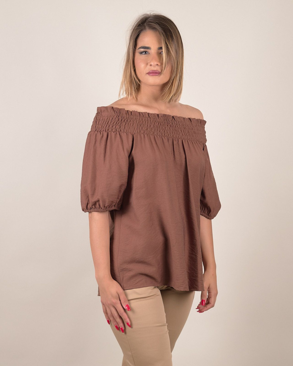 Seducente e leggera, questa blusa off-shoulders è realizzata in morbida viscosa che accarezza la pelle e garantisce il massimo comfort. Il design con scollo elasticizzato lascia le spalle scoperte, donando un tocco femminile e trendy al look. Le maniche a palloncino con elastico al fondo aggiungono volume e un tocco romantico, rendendo questo capo ideale sia per il giorno che per la sera.