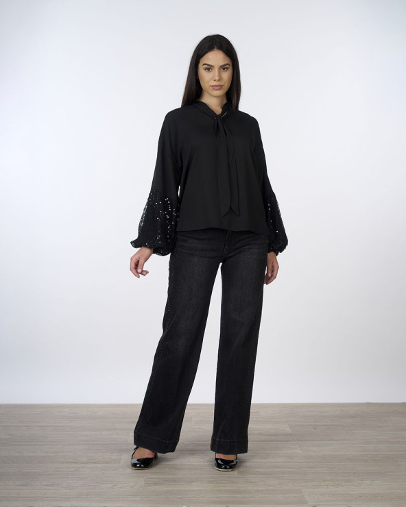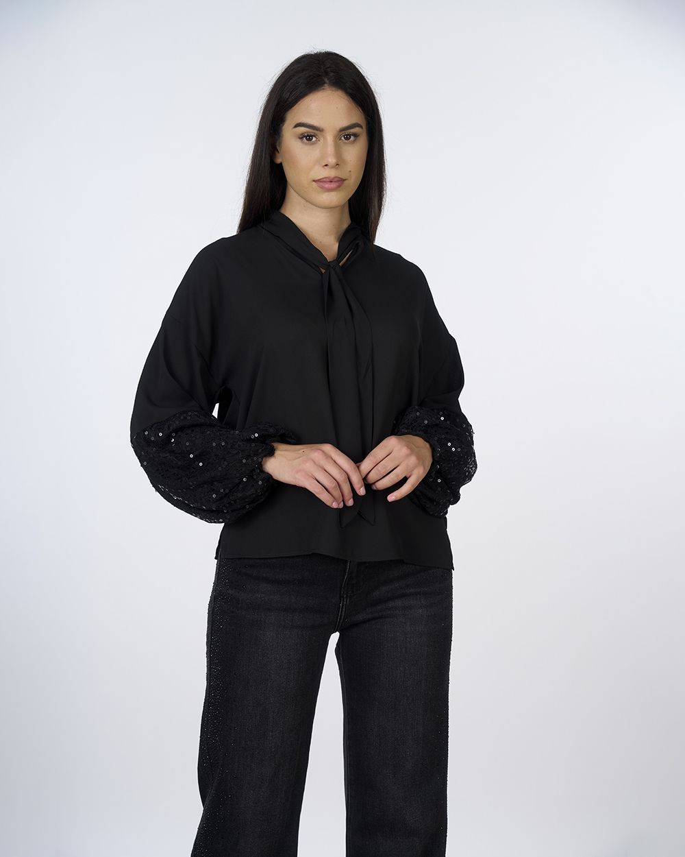 Questa blusa nera con maniche in paillettes è un capo raffinato e moderno, perfetto per valorizzare il guardaroba femminile con un tocco glamour. Realizzata in tessuto fluido e leggero, presenta un elegante scollo con fiocco che conferisce femminilità e stile. Le maniche lunghe a palloncino, impreziosite da inserti in paillettes tono su tono, donano luminosità e rendono il capo ideale per outfit da sera e occasioni speciali.
