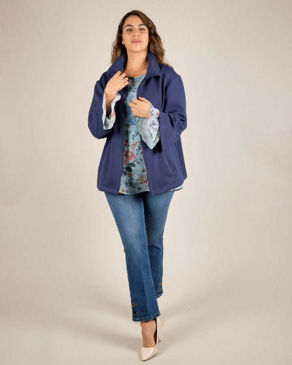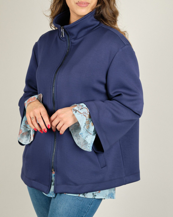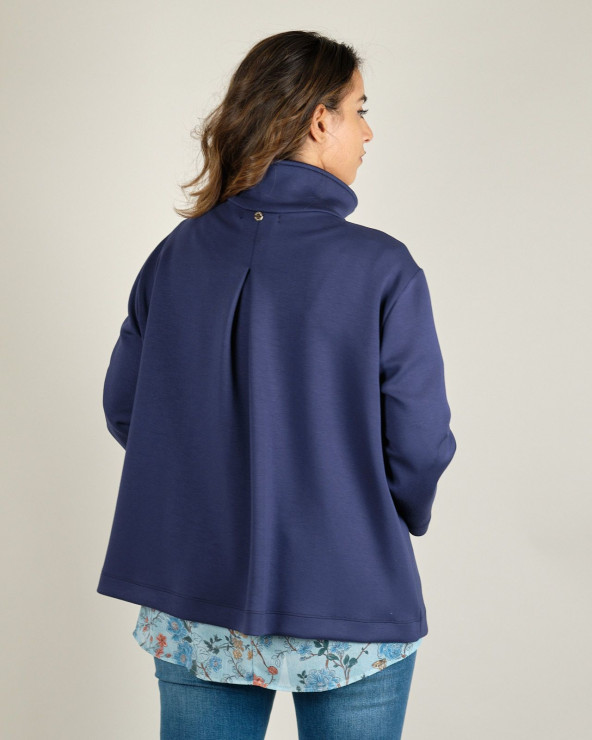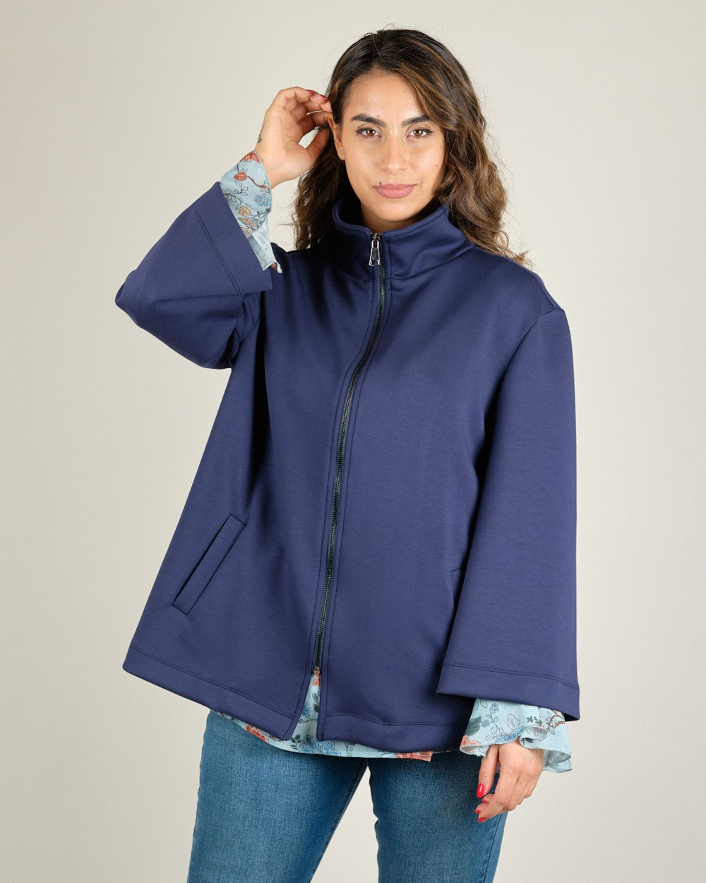 Giacca morbida, modello cappa, in tessuto di scuba. La cappa ha il collo in piedi con chiusura tramite zip a vista.