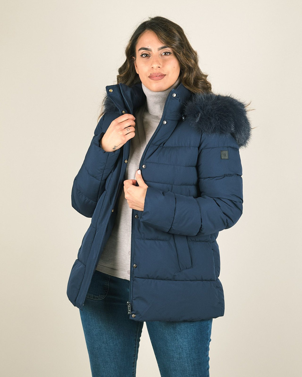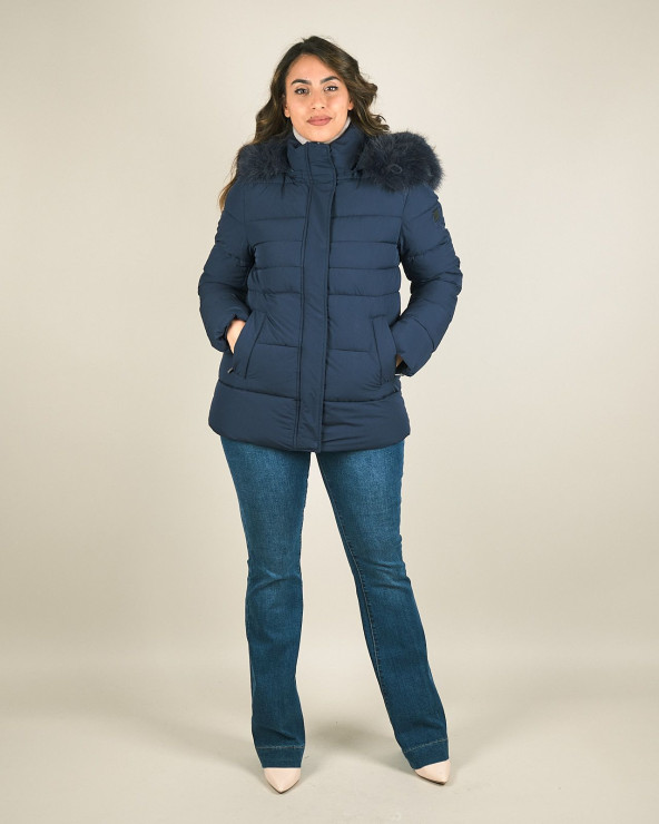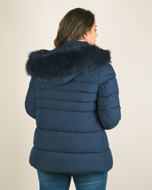 Piumino corto con cappuccio e pelliccia sintetica