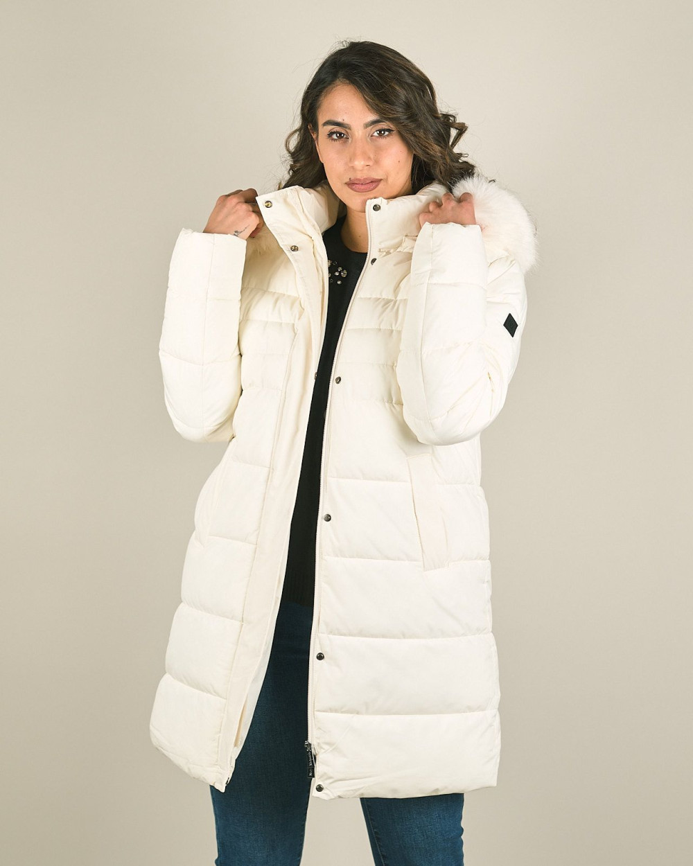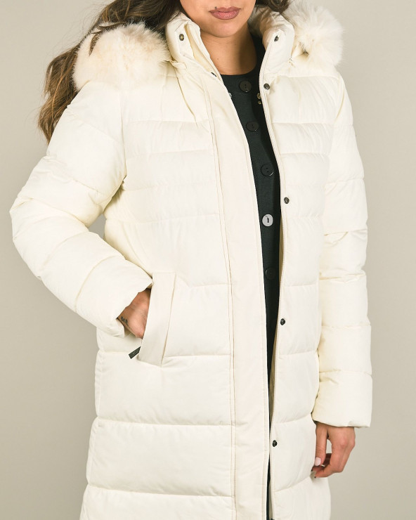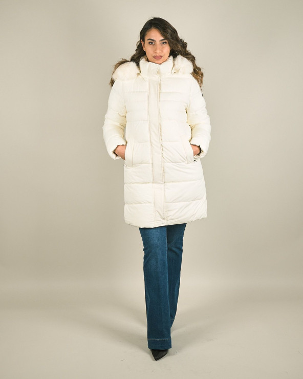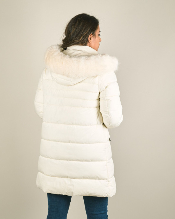 Piumino lungo con cappuccio e pelliccia sintetica
