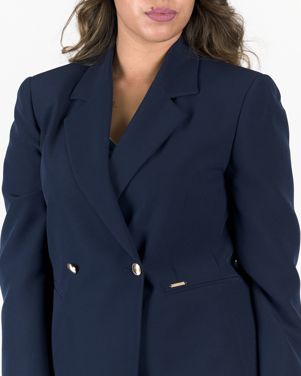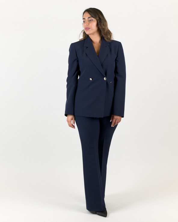 Giacca doppiopetto classica in tessuto di scuba crêpe stretch, collo classico a rever, applicazioni di due bottoni davanti, patta a creare finta tasca.