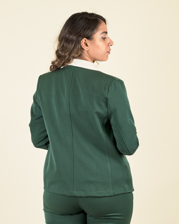 Giacca aperta in tessuto diagonale verde con taglio davanti.