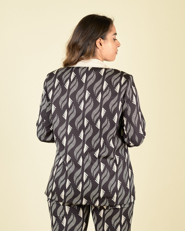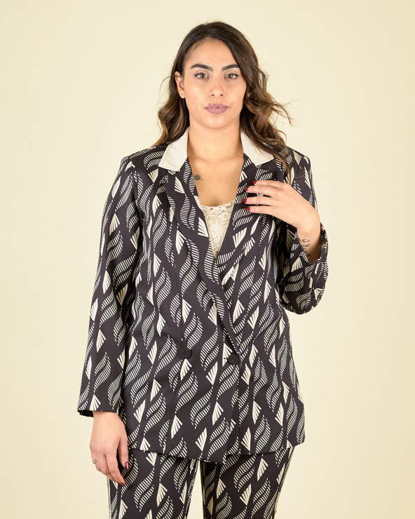 Giacca doppio in tessuto di scuba crêpe in fantasia astratta nero e panna, collo classico bicolore, due bottoni tinta unita davanti, linea classica ed elegante.