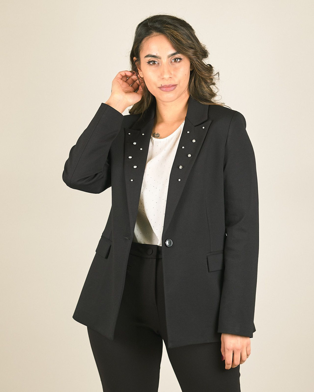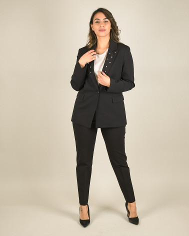 Giacca in punto milano nero con strass su rever