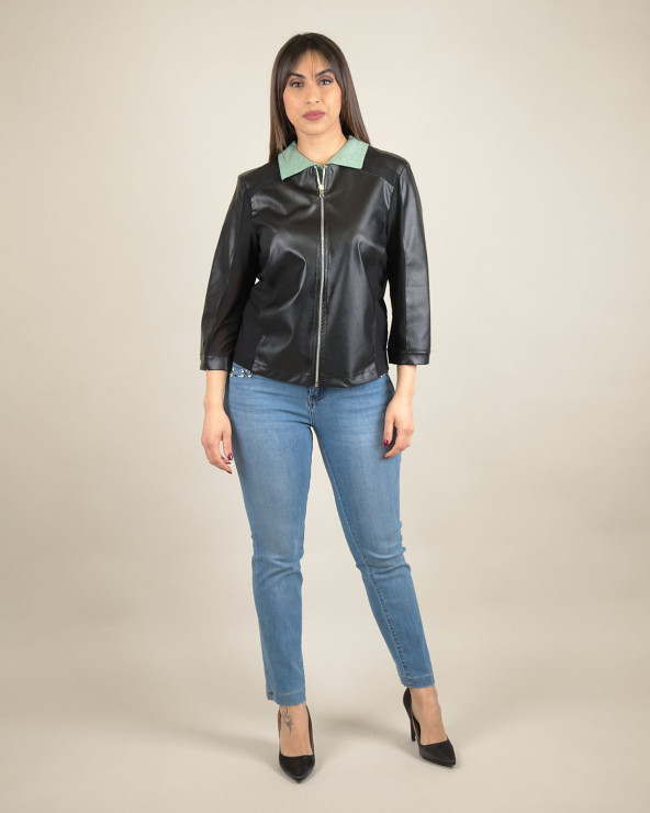 Questa giacca girocollo in ecopelle nera è il capo ideale per un look moderno e sofisticato. Il design essenziale, con zip frontale e taglio leggermente morbido, la rende perfetta per ogni occasione, dal casual al più elegante. Il mix di materiali dona un effetto originale: la parte anteriore in ecopelle aggiunge carattere, mentre il retro in viscosa assicura leggerezza e comfort. Le maniche a tre quarti la rendono particolarmente adatta alla mezza stagione, perfetta da indossare sopra una camicia o una maglia leggera. Un must-have per chi ama lo stile contemporaneo e versatile.