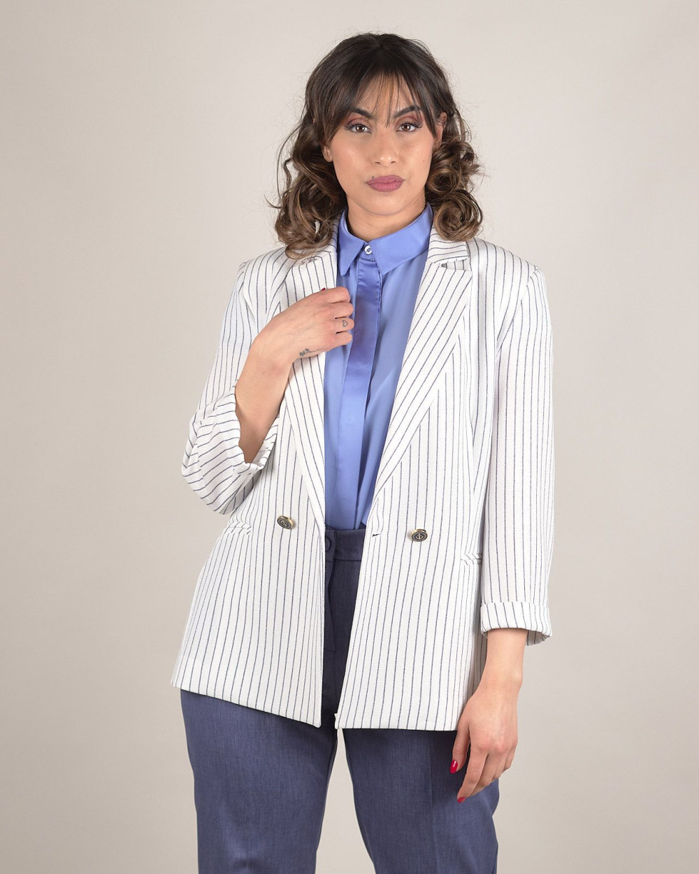 Questo blazer in piquet a righe bianche e blu con bottoni dorati è l'essenza dell'eleganza moderna. Il tessuto in piquet conferisce una texture raffinata e piacevole al tatto, ideale per un look sofisticato e versatile. Il design strutturato con revers classico e chiusura a doppio petto valorizza la silhouette, aggiungendo un tocco di raffinatezza al tuo stile. Perfetto da abbinare sia a pantaloni eleganti che a jeans per un outfit casual chic. Non può mancare nel tuo guardaroba!