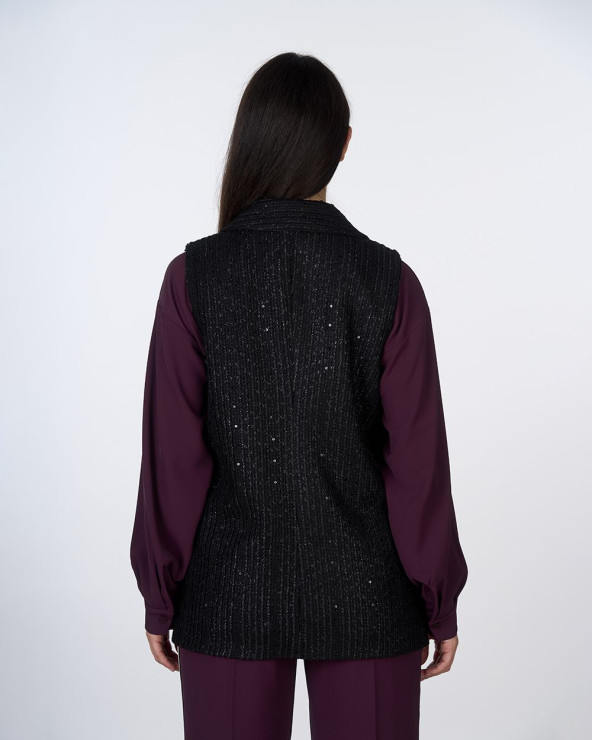 Il gilet doppiopetto nero con paillettes è un capo di grande impatto, pensato per chi desidera aggiungere un tocco di eleganza contemporanea al proprio guardaroba. Realizzato in tessuto strutturato con dettagli luminosi, questo gilet presenta una linea sartoriale che valorizza la silhouette con raffinatezza. Il design doppiopetto con bottoni frontali e tasche applicate esalta il carattere del capo, mentre le paillettes sottili e discrete donano luce e movimento senza risultare eccessive.