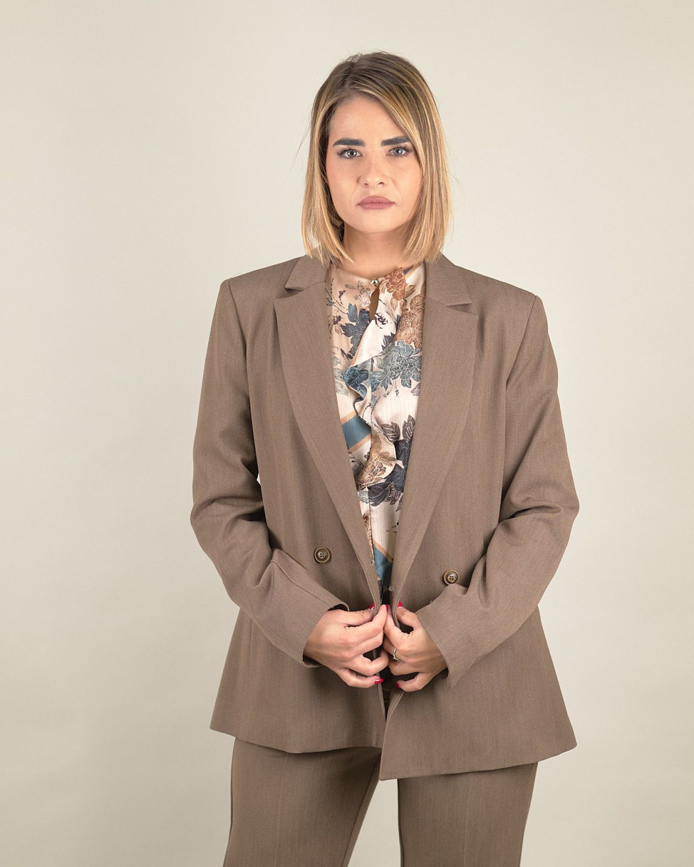 Il taglio doppiopetto con rever classico e bottoni tono su tono dona un’eleganza senza tempo, ideale per occasioni formali o per dare un tocco raffinato agli outfit quotidiani. Il colore fango, neutro e sofisticato, si abbina con facilità a una vasta gamma di tonalità, rendendo questo blazer un must-have del guardaroba femminile.