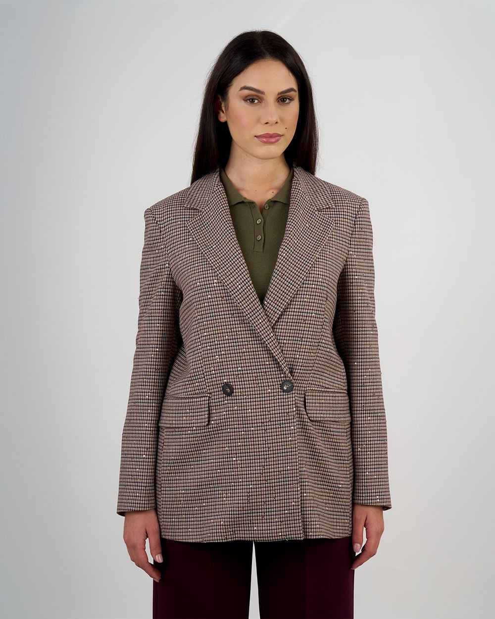 Il design doppiopetto, arricchito da una fantasia a micro quadri e da delicate paillettes tono su tono, aggiunge un tocco glamour discreto e raffinato. Le linee strutturate, i rever classici e le tasche con patta rendono questo capo ideale per completare outfit formali o casual chic.