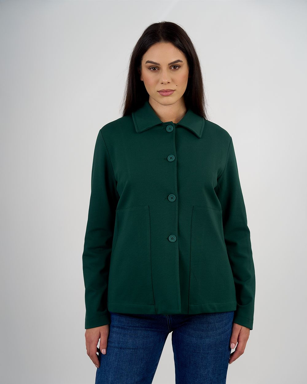 Il modello presenta colletto classico, chiusura frontale con bottoni e ampie tasche applicate sul davanti, perfette per un look pratico ma ricercato.