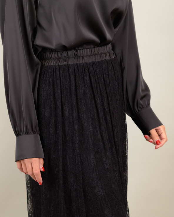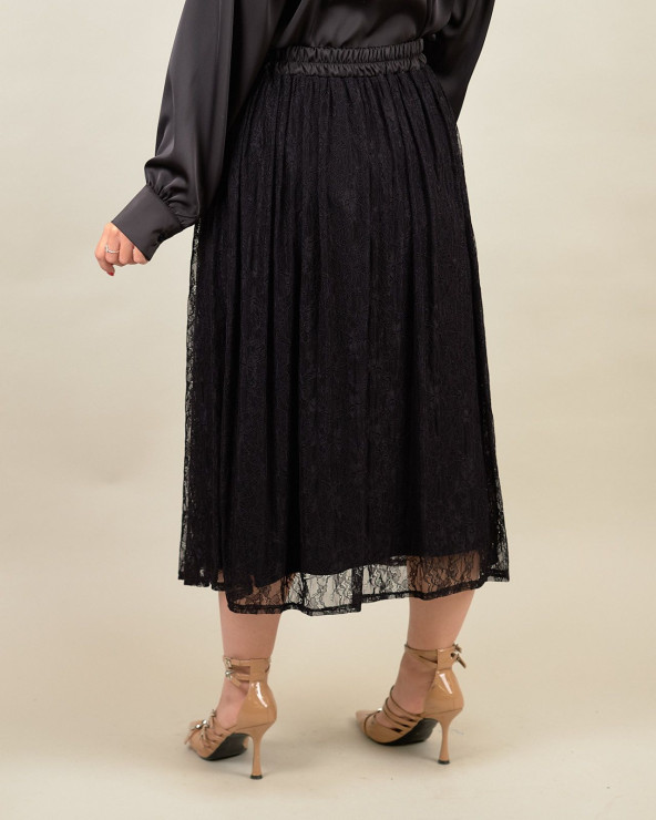Il pizzo floreale semitrasparente regala un tocco delicato e sofisticato, mentre la lunghezza midi e la fodera interna assicurano discrezione e armonia nelle linee. L’elastico in vita valorizza la silhouette e la rende adatta a ogni tipo di fisicità, mantenendo sempre un’eleganza naturale.