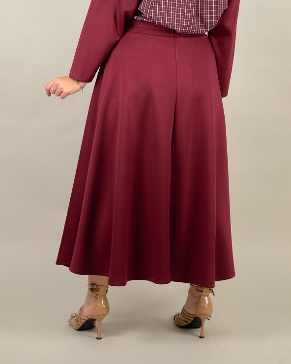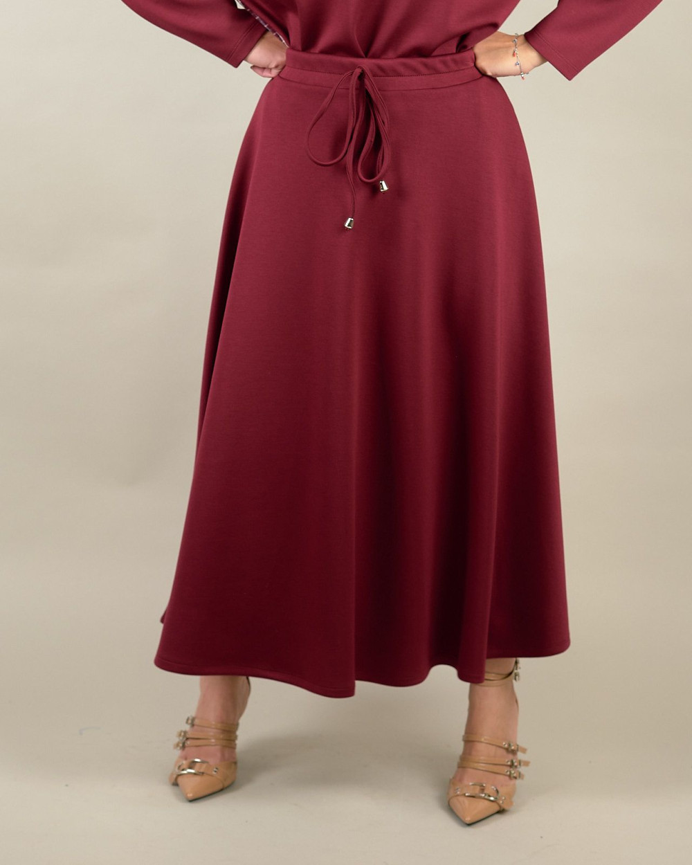 La gonna svasata bordeaux è un capo elegante e versatile, pensato per valorizzare le forme femminili con naturalezza. Realizzata in un morbido tessuto misto viscosa e rayon, assicura una vestibilità fluida e confortevole, perfetta per accompagnarti durante tutta la giornata.