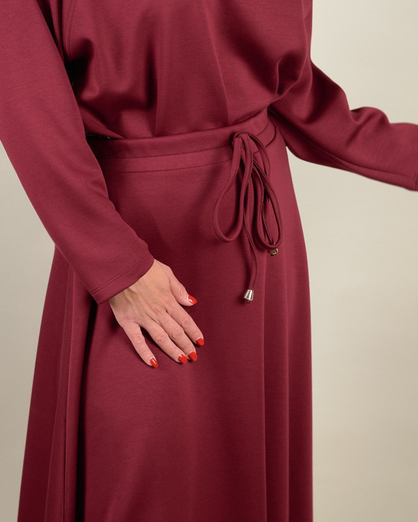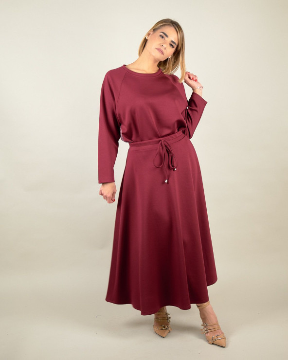 Il taglio svasato cade armoniosamente lungo la silhouette, mentre la vita elasticizzata con coulisse regolabile garantisce comfort e praticità, adattandosi con delicatezza alle curve. Il colore bordeaux intenso aggiunge un tocco di eleganza sofisticata, ideale per look curvy contemporanei e raffinati.
