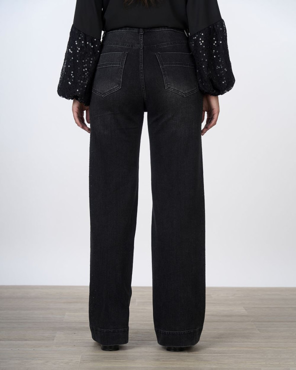Questi jeans wide leg uniscono eleganza e modernità, perfetti per un look sofisticato che non passa inosservato. Il denim nero è arricchito da dettagli di strass applicati lungo i lati, che donano un tocco luminoso e glamour ideale per le serate speciali o per outfit ricercati dal carattere deciso. La vita alta valorizza la silhouette, mentre la gamba ampia regala comfort e libertà di movimento, mantenendo una linea fluida e contemporanea.