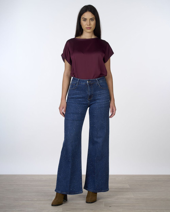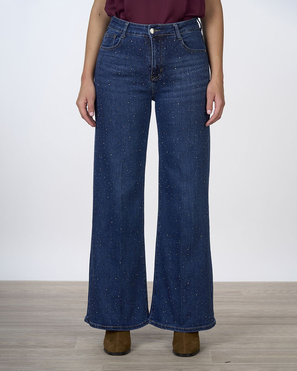 Il jeans wide leg con strass all over è un capo di tendenza che unisce la praticità del denim al fascino luminoso delle applicazioni scintillanti. Realizzato in denim elasticizzato di alta qualità, presenta una vestibilità comoda e morbida che segue le forme senza costringerle, regalando comfort e stile in ogni occasione. La gamba ampia e fluida dona slancio alla silhouette, mentre gli strass distribuiti su tutta la superficie aggiungono un tocco glamour che rende questo modello unico e ricercato.