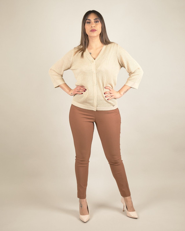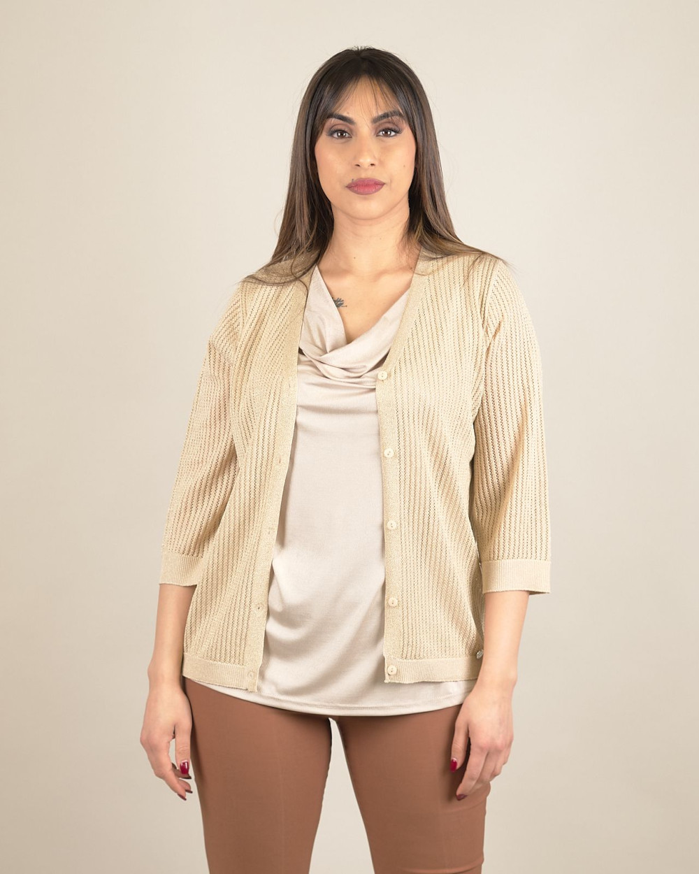 Questo cardigan in maglia traforata con lurex è la scelta perfetta per aggiungere un tocco di eleganza ai tuoi outfit. Il tessuto leggero e traspirante offre comfort e freschezza, mentre il delicato effetto brillante dona luminosità senza eccessi. Il design con scollo a V e chiusura a bottoni lo rende versatile e adatto sia a look casual che più raffinati. Perfetto da indossare sopra una canotta per un effetto sofisticato o abbinato a un abito per una serata speciale. Un capo pratico e chic, ideale per completare il guardaroba con stile.