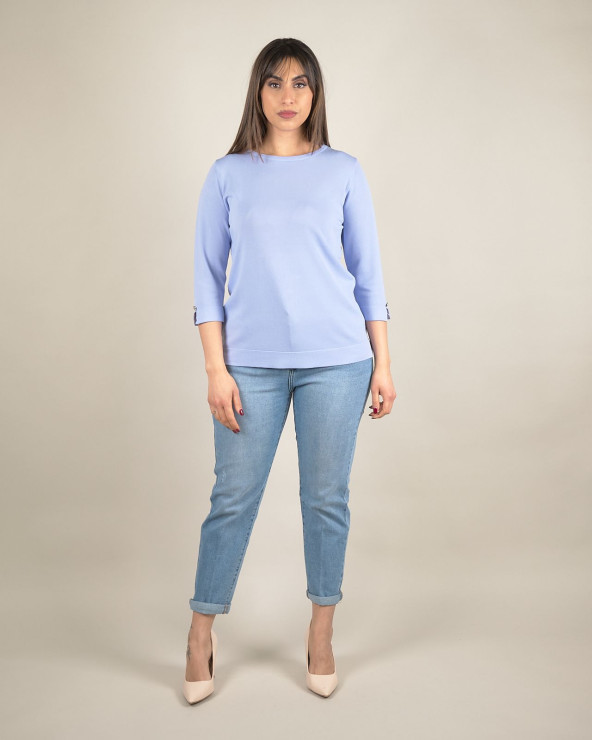 Maglia girocollo in filo dal design essenziale e raffinato, perfetta per ogni occasione. Il tessuto in misto viscosa assicura una vestibilità morbida e confortevole, avvolgendo delicatamente la silhouette. Le maniche a tre quarti con piccolo dettaglio sul polsino aggiungono un tocco di eleganza discreta. Ideale per essere abbinata a jeans per un look casual oppure a pantaloni sartoriali per un outfit più sofisticato. Un capo versatile che non può mancare nel guardaroba.