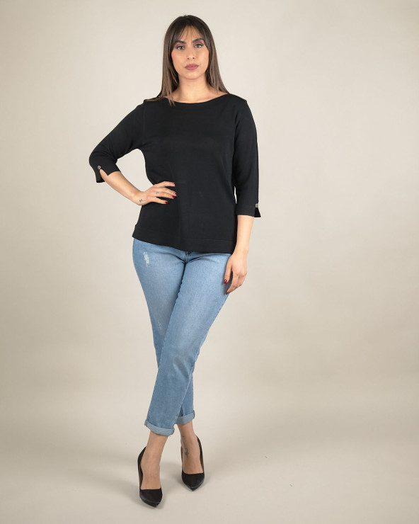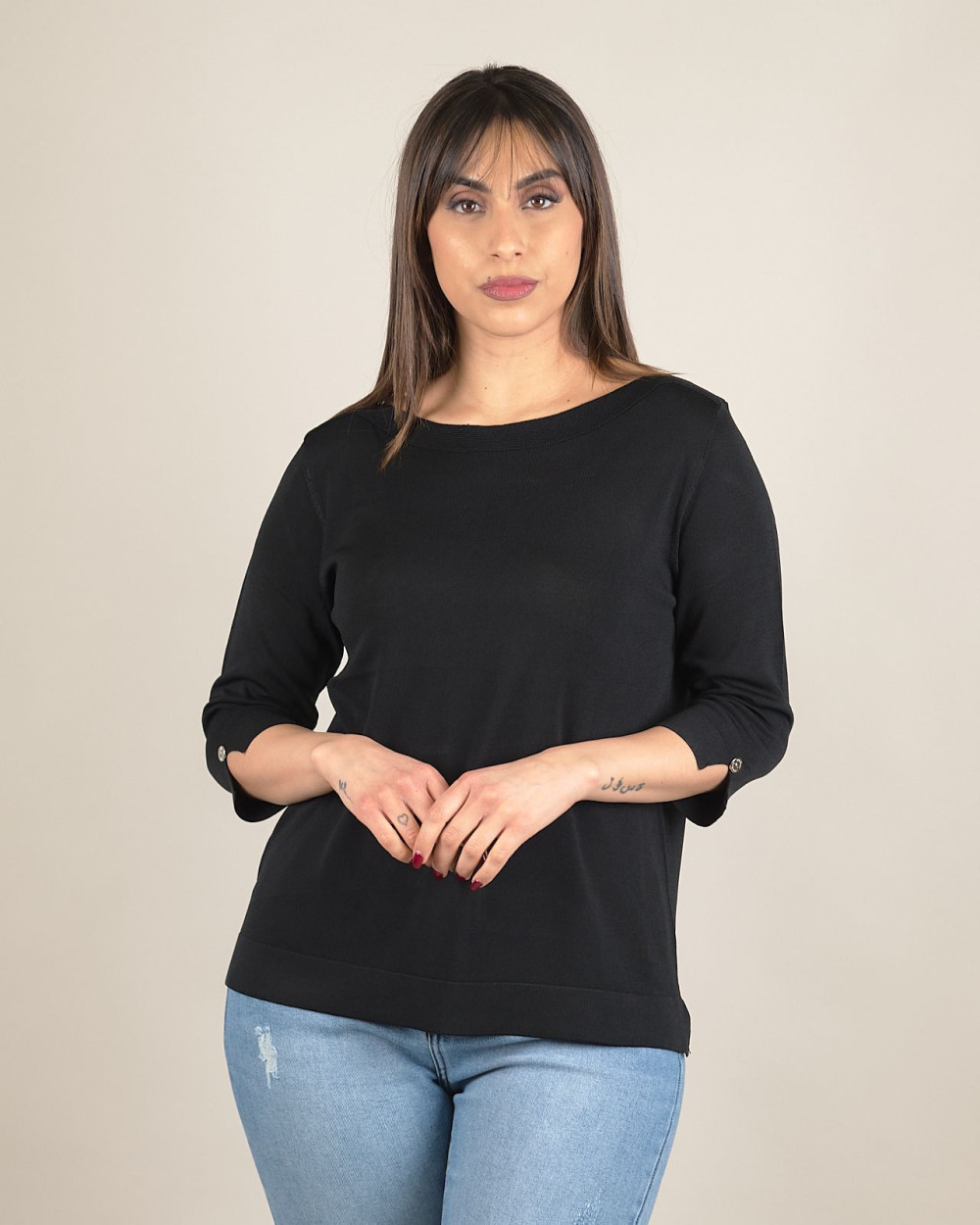 La maglia in filo con scollo ampio è un capo essenziale per un look raffinato e confortevole. Realizzata in un morbido mix di viscosa ed elastan, offre una vestibilità fluida che avvolge delicatamente la figura. Il design con maniche a tre quarti e il dettaglio sui polsini donano un tocco di eleganza, rendendola perfetta per outfit casual chic o da ufficio. La sua leggerezza la rende ideale per le mezze stagioni, mentre la versatilità permette di abbinarla sia con jeans che con pantaloni eleganti.