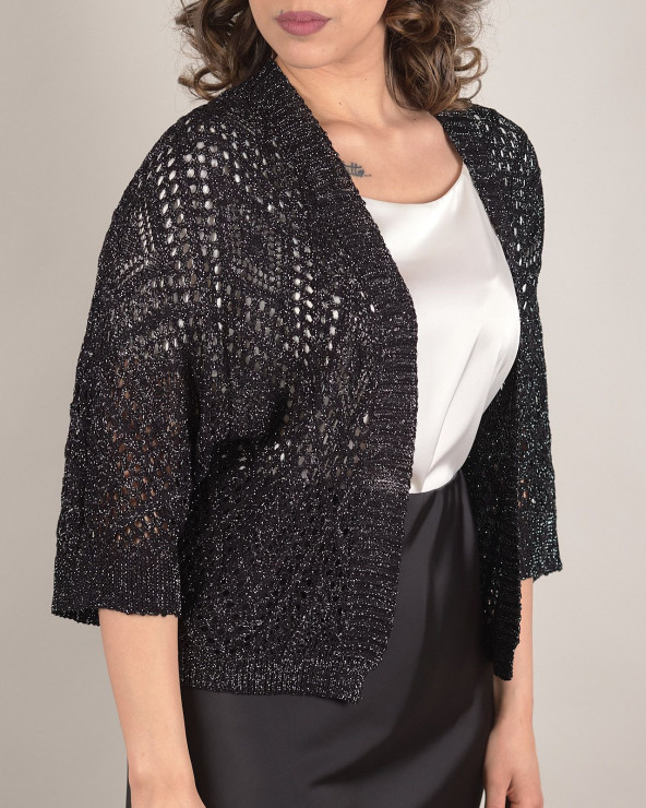 Elegante cardigan corto realizzato con un raffinato motivo traforato che dona leggerezza e movimento al capo. Il filato lurex aggiunge un tocco brillante e glamour, rendendolo perfetto per outfit sia casual che formali. La lunghezza ridotta e la vestibilità morbida lo rendono ideale da abbinare a top e abiti per creare look sofisticati e femminili. Perfetto per aggiungere un dettaglio luminoso ai tuoi outfit serali o quotidiani.