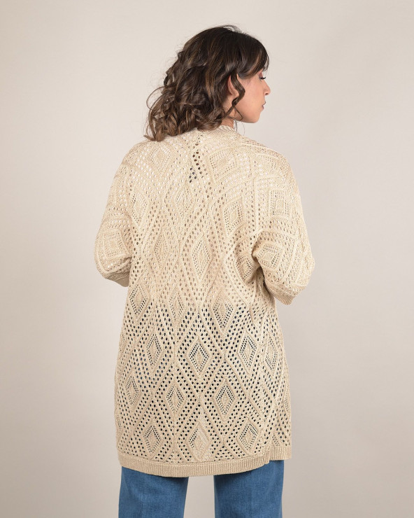 Cardigan lungo dallo stile raffinato e sofisticato, realizzato con un elegante motivo traforato che dona leggerezza e movimento al capo. Il filato lurex integrato aggiunge un tocco brillante e glamour, perfetto per creare look esclusivi e ricercati. La vestibilità morbida e confortevole lo rende ideale da abbinare sia a look casual che eleganti. Indossalo sopra un top o una camicia per aggiungere un tocco di classe ai tuoi outfit serali o quotidiani.