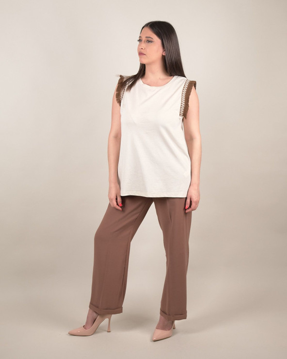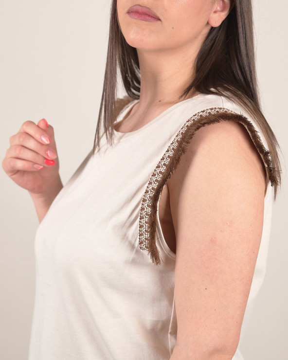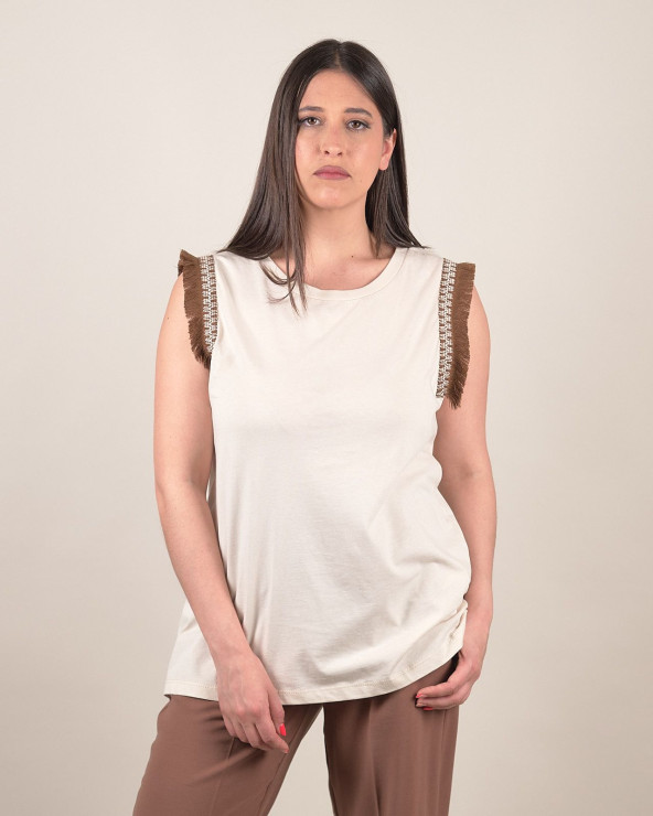 Perfetto per un look casual ricercato, questo top in puro cotone si distingue per i dettagli a frange sulle spalle che aggiungono un tocco originale e di tendenza. La linea morbida e il taglio dritto valorizzano la figura con naturalezza, garantendo comfort e praticità durante tutta la giornata. Il design senza maniche lo rende ideale per la stagione calda, mentre i bordi a contrasto creano un interessante gioco di stile. Indossalo con pantaloni a gamba dritta o shorts per un outfit rilassato ma curato, oppure abbinalo a blazer leggeri per un look casual chic.
