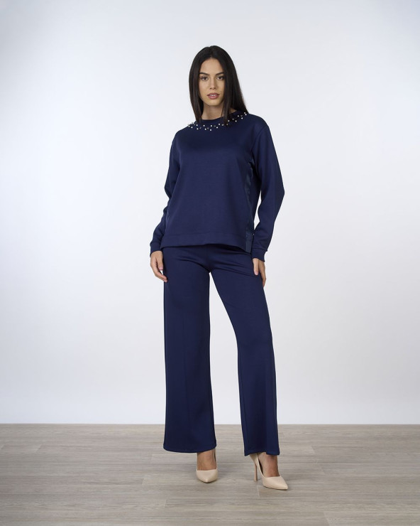 Questa felpa blu con applicazioni gioiello è il capo perfetto per chi ama unire comfort e stile sofisticato. Realizzata in un morbido tessuto misto viscosa, poliestere ed elastane, offre una vestibilità confortevole e piacevole sulla pelle. La linea semplice e pulita viene impreziosita dalle applicazioni gioiello poste sullo scollo, che illuminano il capo e lo rendono unico e raffinato.