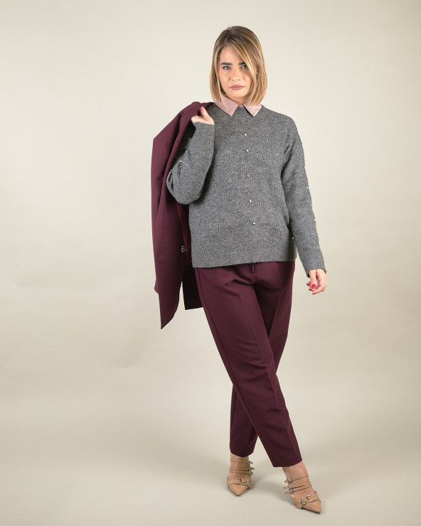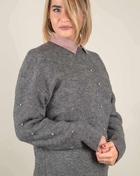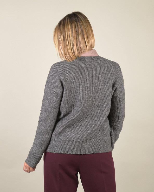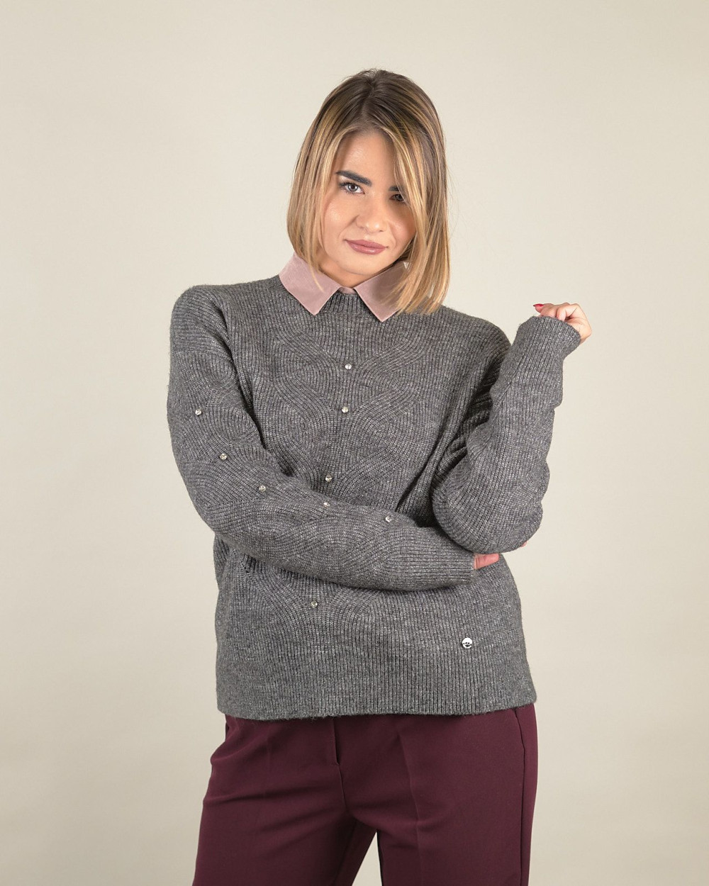 Il modello presenta una lavorazione a costine con motivo decorativo frontale arricchito da piccole perle applicate, che aggiungono un dettaglio luminoso e sofisticato. Il girocollo e il taglio regolare la rendono versatile e facile da abbinare sia a pantaloni eleganti che a jeans casual.