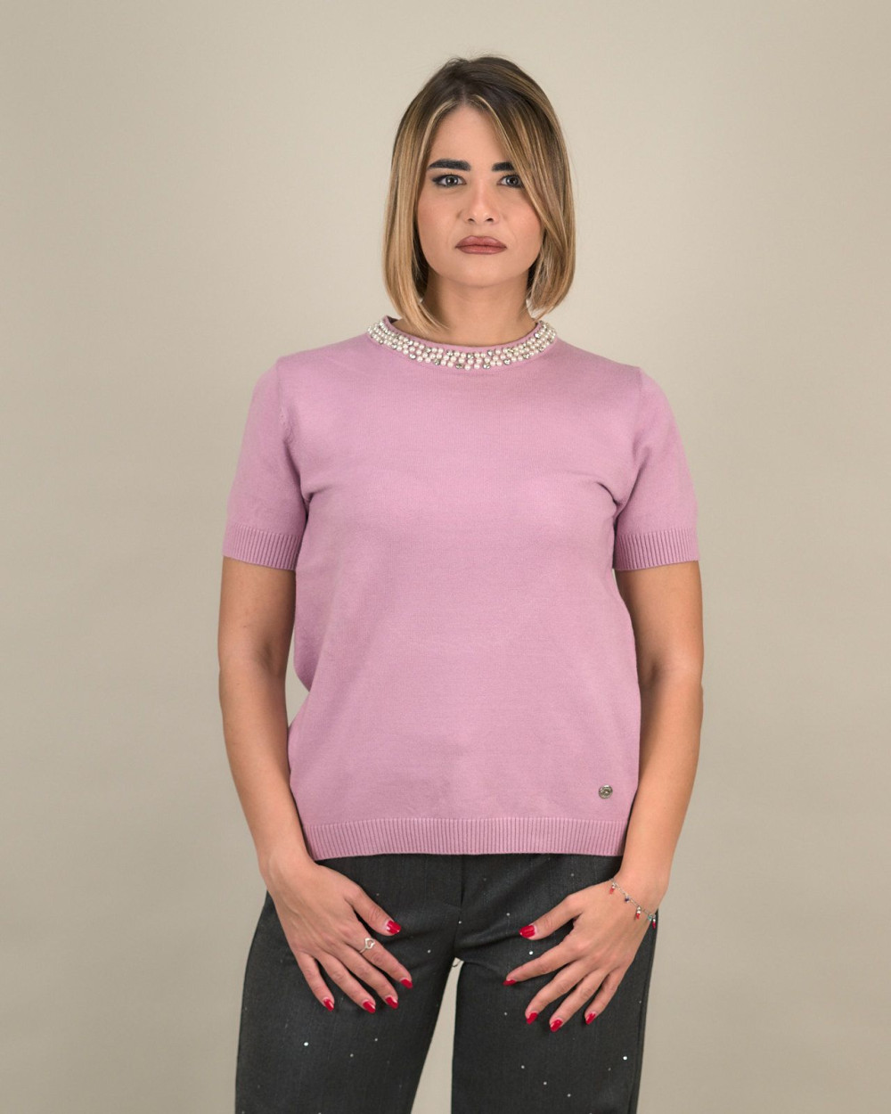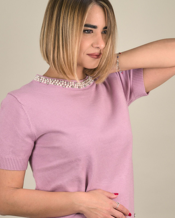 Il collo decorato con perle e strass dona un tocco luminoso e sofisticato, rendendo questa maglia adatta sia per il giorno che per la sera. Le maniche corte e il taglio regolare la rendono facile da abbinare sotto blazer o cardigan, per un look curato e sempre alla moda.