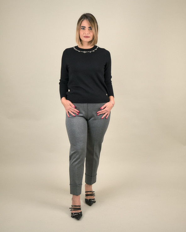 Il dettaglio di piccole applicazioni luminose intorno al girocollo dona un tocco raffinato e femminile, ideale per impreziosire anche i look più semplici. Le linee pulite e il design essenziale la rendono versatile e adatta a diverse occasioni, dal lavoro alle serate più chic.