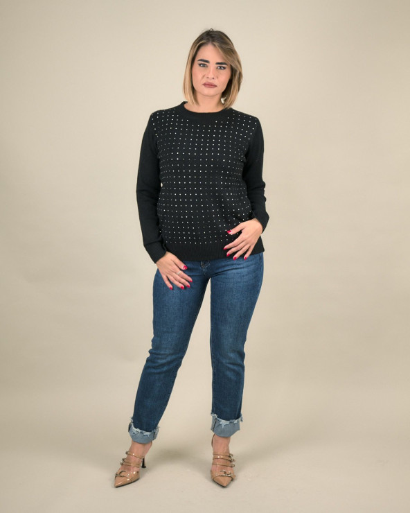 Il design con scollo tondo e applicazioni di micro strass sul davanti illumina il capo con discreta raffinatezza. Versatile e femminile, è ideale sia per look casual con jeans, sia per abbinamenti più chic con pantaloni eleganti o gonne midi.