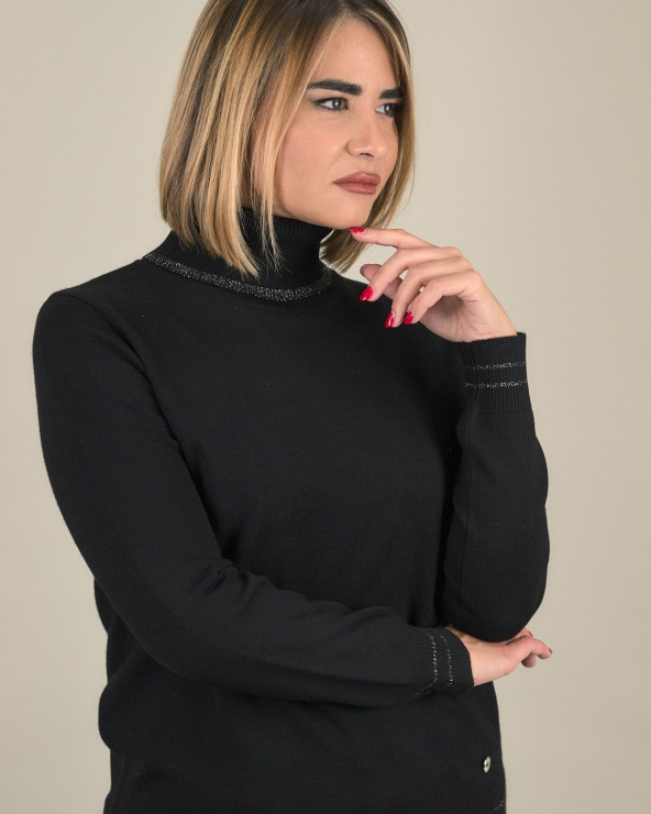 Il collo alto e i bordi rifiniti con delicati fili lurex aggiungono un tocco luminoso ed elegante, perfetto per creare look curvy sofisticati e sempre attuali. Da abbinare a pantaloni eleganti o jeans per un outfit casual chic.
