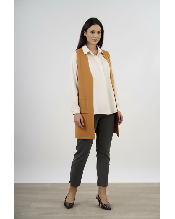 Gilet lungo in maglia fine, dal design elegante e versatile. Realizzato in un tessuto morbido ed elasticizzato, questo capo si adatta perfettamente alla silhouette offrendo comfort e libertà di movimento.