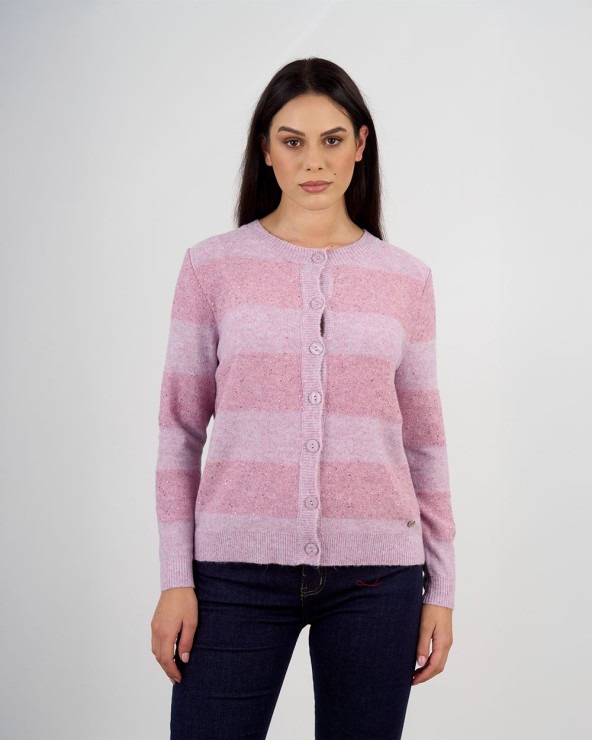 Cardigan con trama in paillettes nei toni del fango e del beige, che aggiunge un tocco luminoso e sofisticato al look.