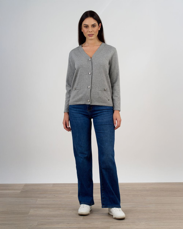 Cardigan con elegante scollo a V e chiusura frontale con bottoni gioiello, che donano al capo un tocco raffinato e luminoso.