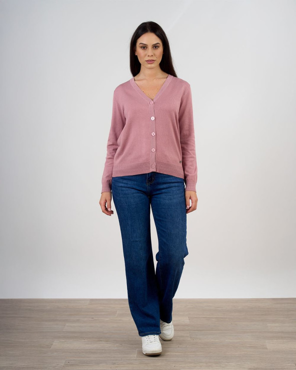 Cardigan con scollo a V e chiusura frontale a bottoni, impreziosito da raffinati profili in lurex che illuminano delicatamente il bordo e i polsini.