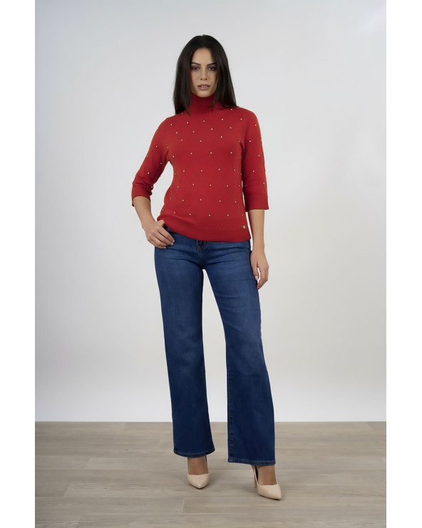 Maglia dolcevita dallo stile raffinato e contemporaneo, caratterizzata da una trama a rombi decorata con piccole applicazioni gioiello che donano un tocco luminoso e femminile.