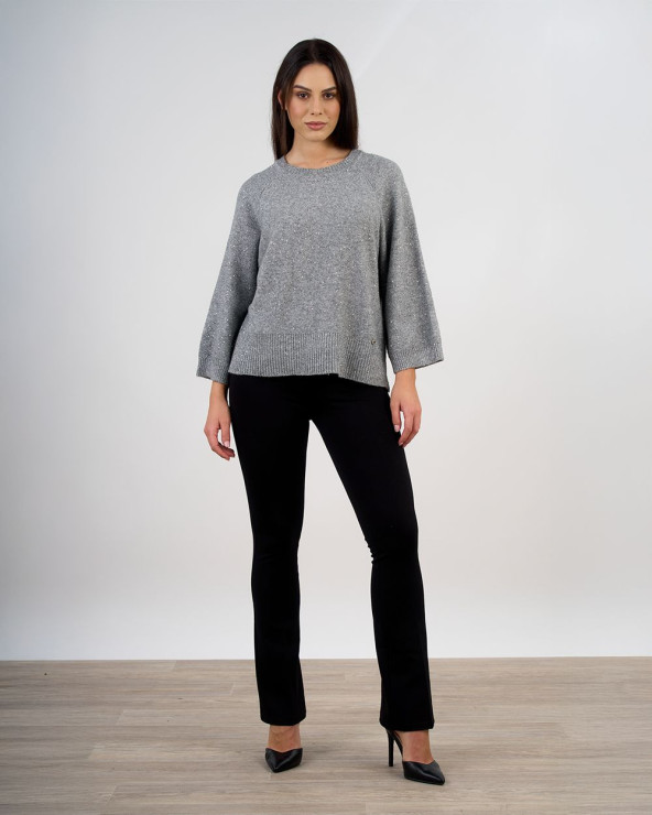 Maglia svasata dal taglio moderno e femminile, caratterizzata da una delicata lavorazione a micro paillettes che illumina il tessuto con riflessi discreti e raffinati.